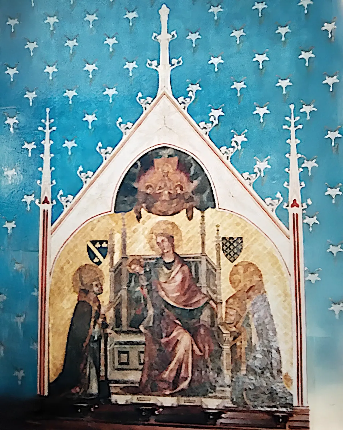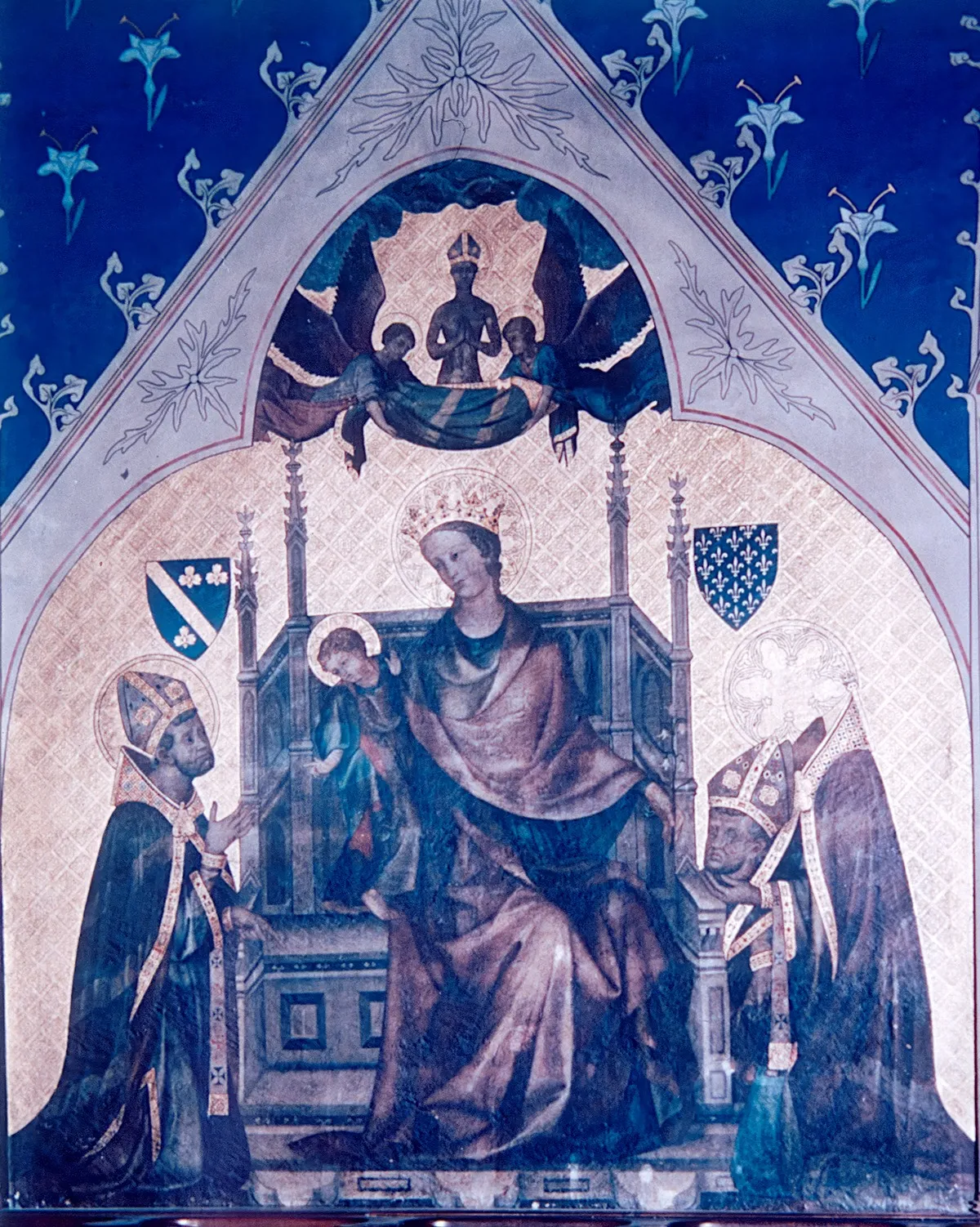Cette peinture murale surplombait le tombeau de Matifas de Buci, mort en 1304, 10° évêque de la cathédrale N.D. Paris, qui avait construit les chapelles axiales du choeur de la cathédrale dont l’une (celle-ci) était dédiée à saint Nicaise.