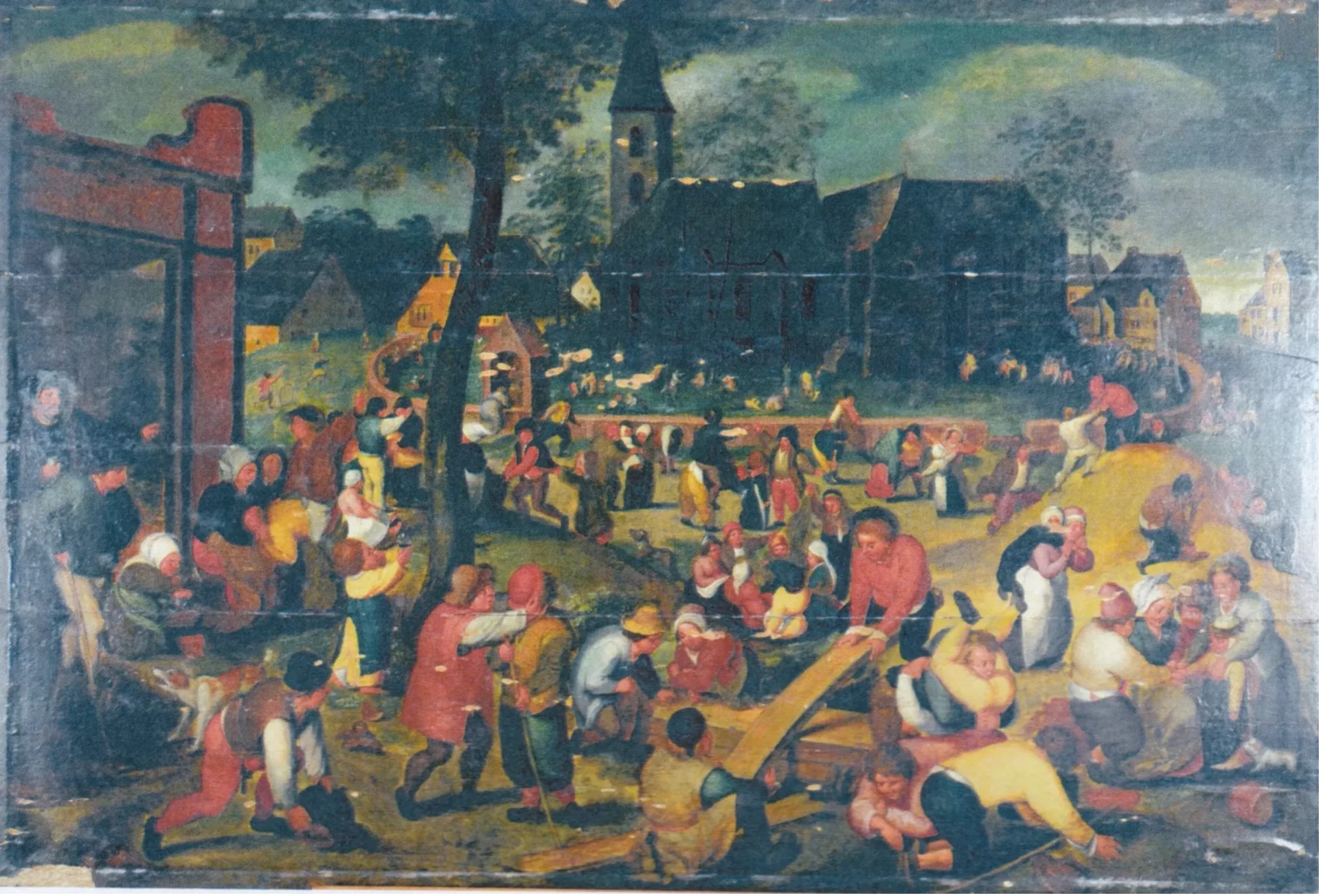 Dans ce tableau intitulé « jeux d’enfant », deux enfants jouent devant la porte du transept de l’église à la toupie avec une tête d’homme coupée !